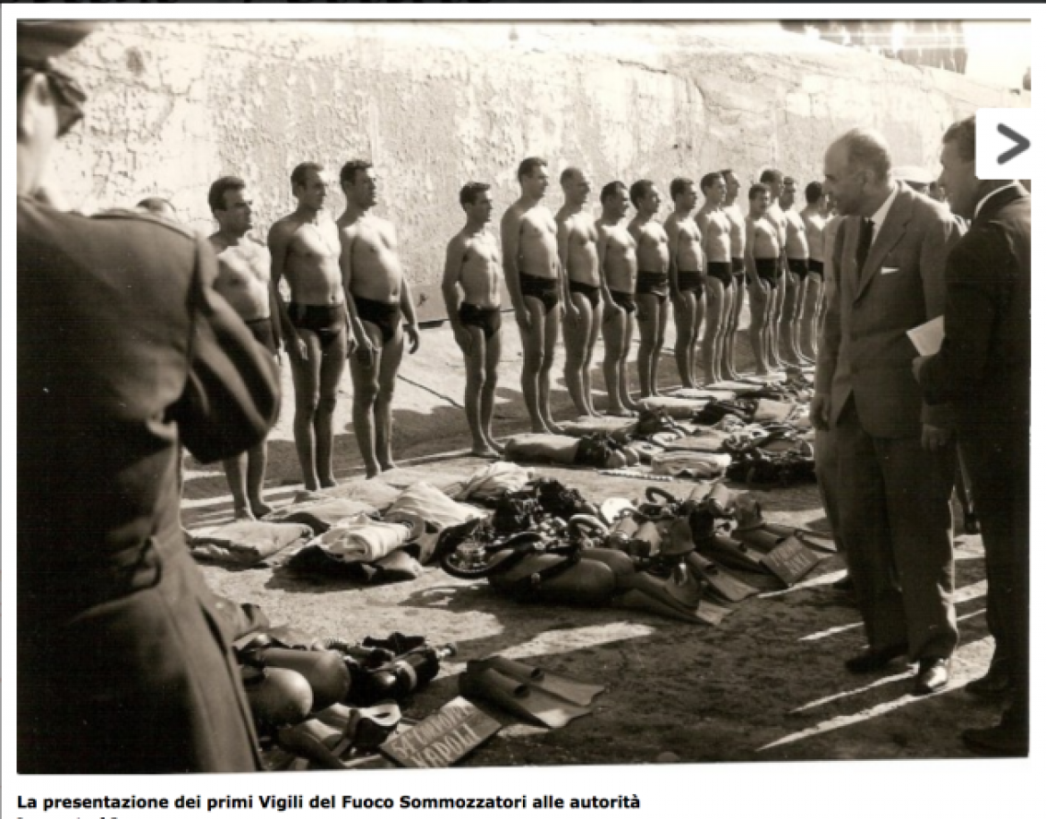 Tutto è fatto così per bene che nel 1952 gli viene conferito l’incarico di svolgere il primo corso Sommozzatori dei Vigili del Fuoco. Dopo 60 giorni, vengono brevettati 32 Vigili del Fuoco, i quali tornano ai Comandi di appartenenza per iniziare la loro speciale attività. Il Corpo Nazionale dei Vigili del Fuoco fu a livello internazionale la prima organizzazione non militare a dotarsi di sommozzatori per scopi civili, al servizio dello Stato.