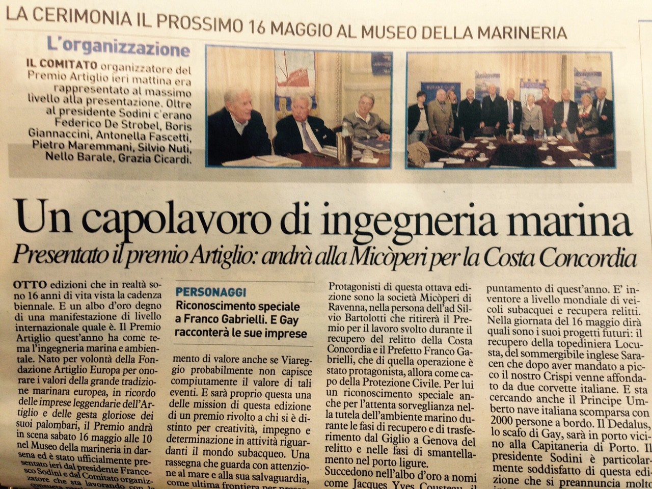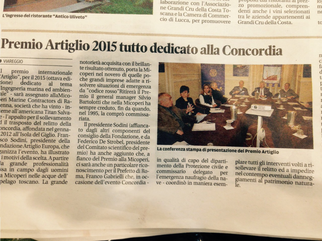 Ormai sono passati giorni dall’emozionante giornata del 16 maggio, quando al Museo della Marineria di Viareggio “Alberto Gianni” è stato consegnato il Premio Internazionale Artiglio alla MICOPERI per il recupero del relitto della Costa Concordia. Sono passati giorni ma ancora le parole di Silvio Bartolotti, AD della MICOPERI, fanno eco nelle nostre anime. Così come quelle del Prefetto Franco Gabrielli cui è stato dato un riconoscimento speciale.
