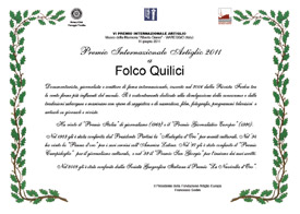 Folco Quilici celebre documentarista, giornalista e scrittore, nato a Ferrara nel 1930, si è costantemente dedicato alla divulgazione delle conoscenze e delle tradizioni subacquee e marinare, tema del Premio Artiglio 2011. E' autore di una produzione vastissima: fotografie, film, programmi televisivi, opere di saggistica e di narrativa, articoli sulla stampa italiana ed internazionale: tutte opere che lo hanno reso universalmente famoso.