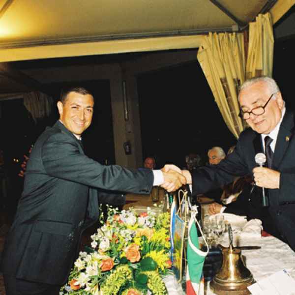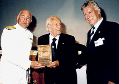 Il Presidente della Fondazione Artiglio Europa Francesco Sodini (a destra) mentre consegna il premio "Una vita per la subacquea" al comandante Raimondo Bucher (al centro) assistito dall'Ammiraglio Salvatore Giuffrè , Direttore Marittimo della Toscana.