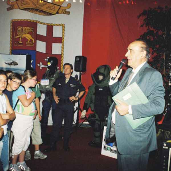 Il Sottosegretario ROBERTO ROSSO , in rappresentanza del Ministro Roberto Maroni, appunta questa alta Onorificenza sui Gonfaloni delle Regioni di appartenenza dei membri dell'Equipaggio del 1° Artiglio e precisamente