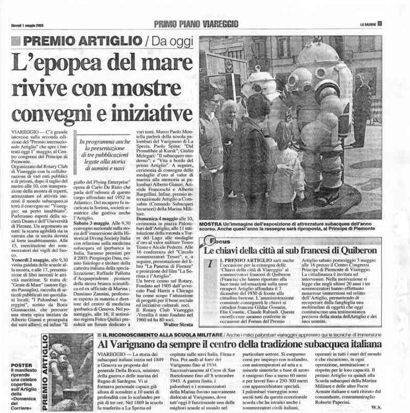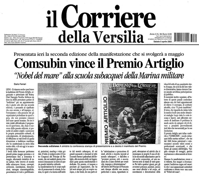 Il Corriere della Versilia 05/04/2003 Consubin vince il Premio artiglio Nobel del mare alla scuola subacquei della Marina Militare